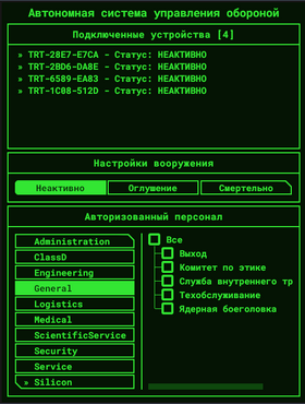 Турели - это высокотехнологичное оружие, способная стрелять так и нелеталом, так и леталом. Для того, чтобы с ними взаимодействовать, следует найти панель управления охранной турелью в Ядре ИИ и нажать на неё.